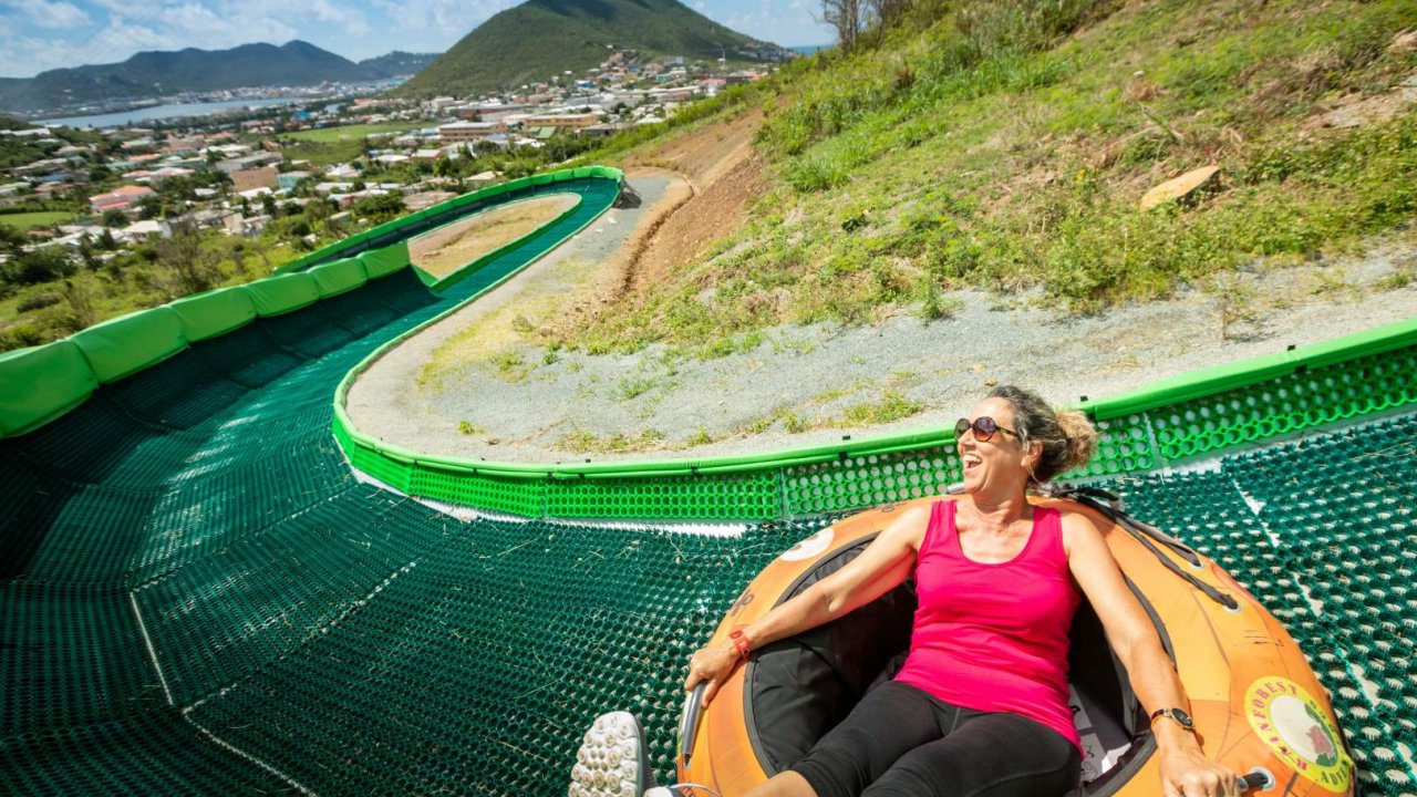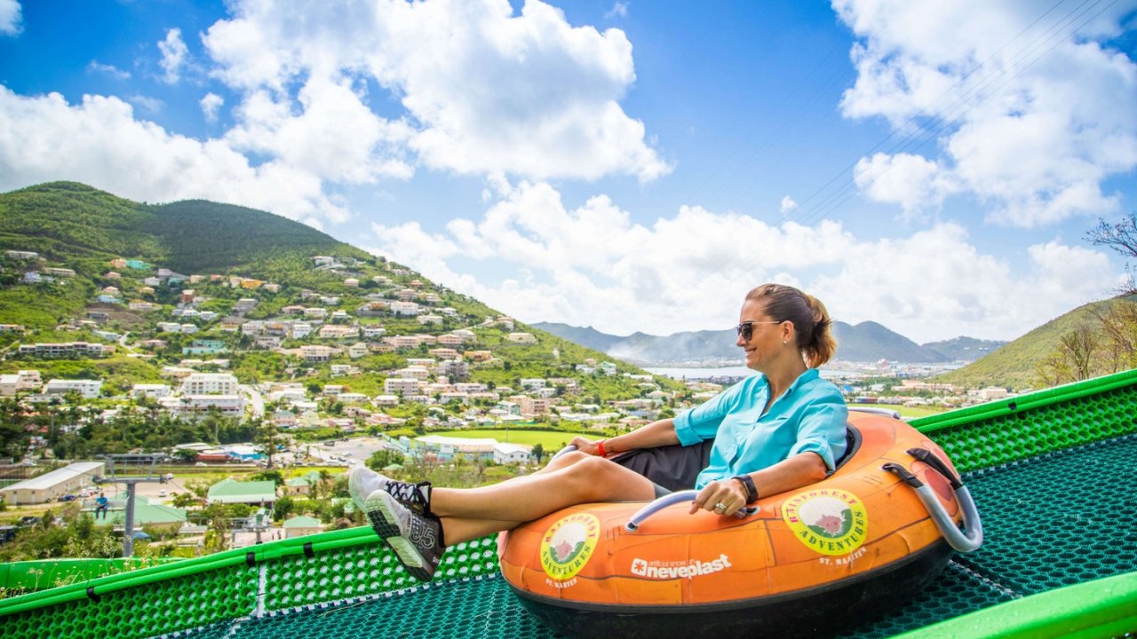A top-to-bottom tour with two exciting experiences in one excursion. Take in the amazingviews as you glide to the top of one of St. Maarten’s highest mountains on the Sky Explorer. Then hop back on the Sky Explorer to the Schooner Ride where you’ll surf downthe mountain in an inner tube.