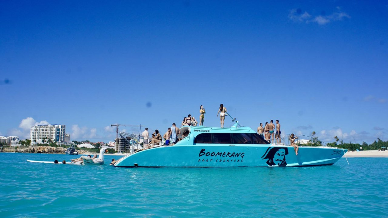 Tour St Maarten's hottest spots in style! Boomerang is a power cat with powerful 380hp engines making her fast and stable. This St Maarten boat charter has all the toys, paddle boards, snorkeling gear, floats, and noodles that will make your day a blast. The easy access staircase will help you in and out of the water with ease. Boomerang is also equipped with an on board bathroom so you don't have to hold it or go in the water. And don't worry, Boomerang's state of the art stereo will keep the music going all day long!!