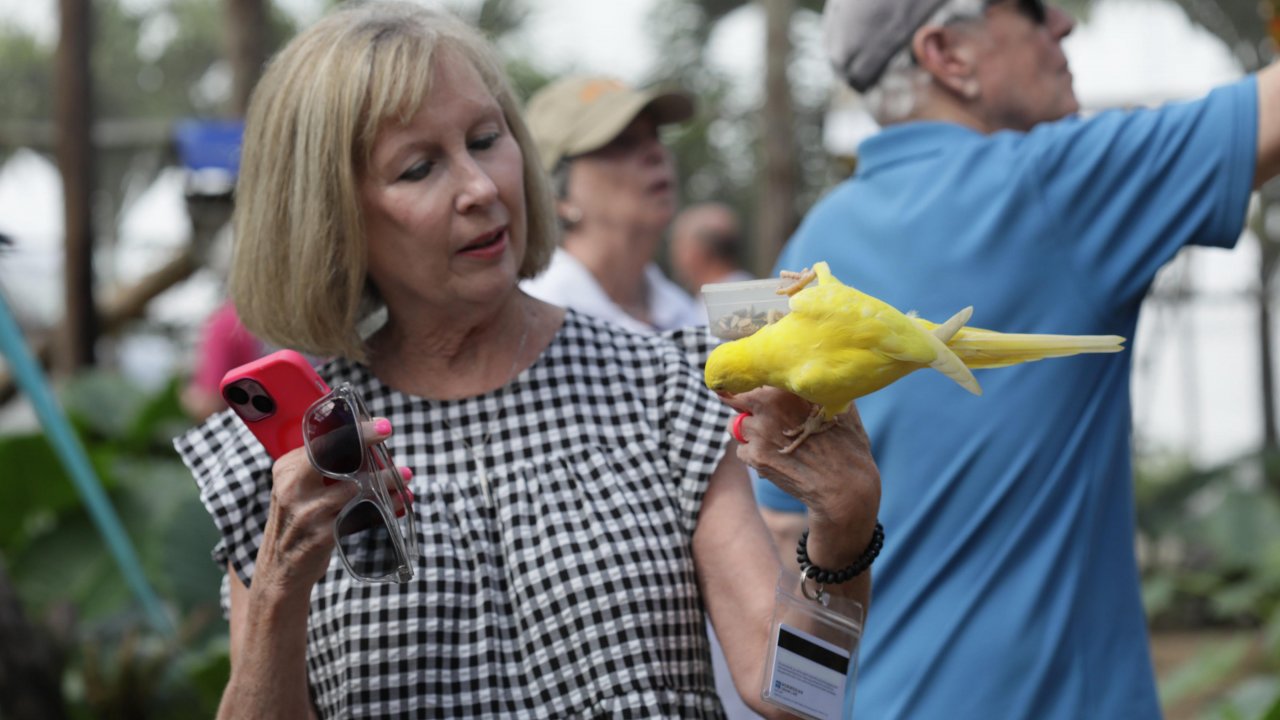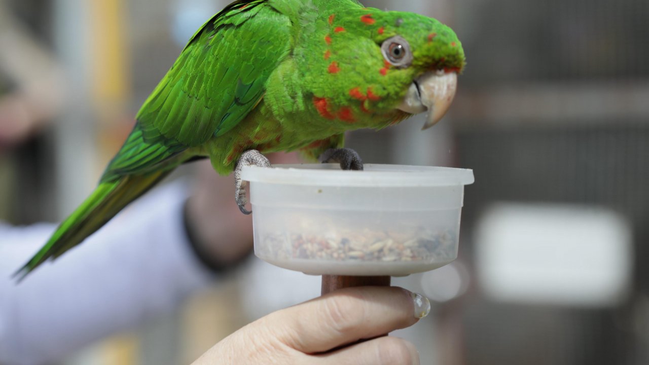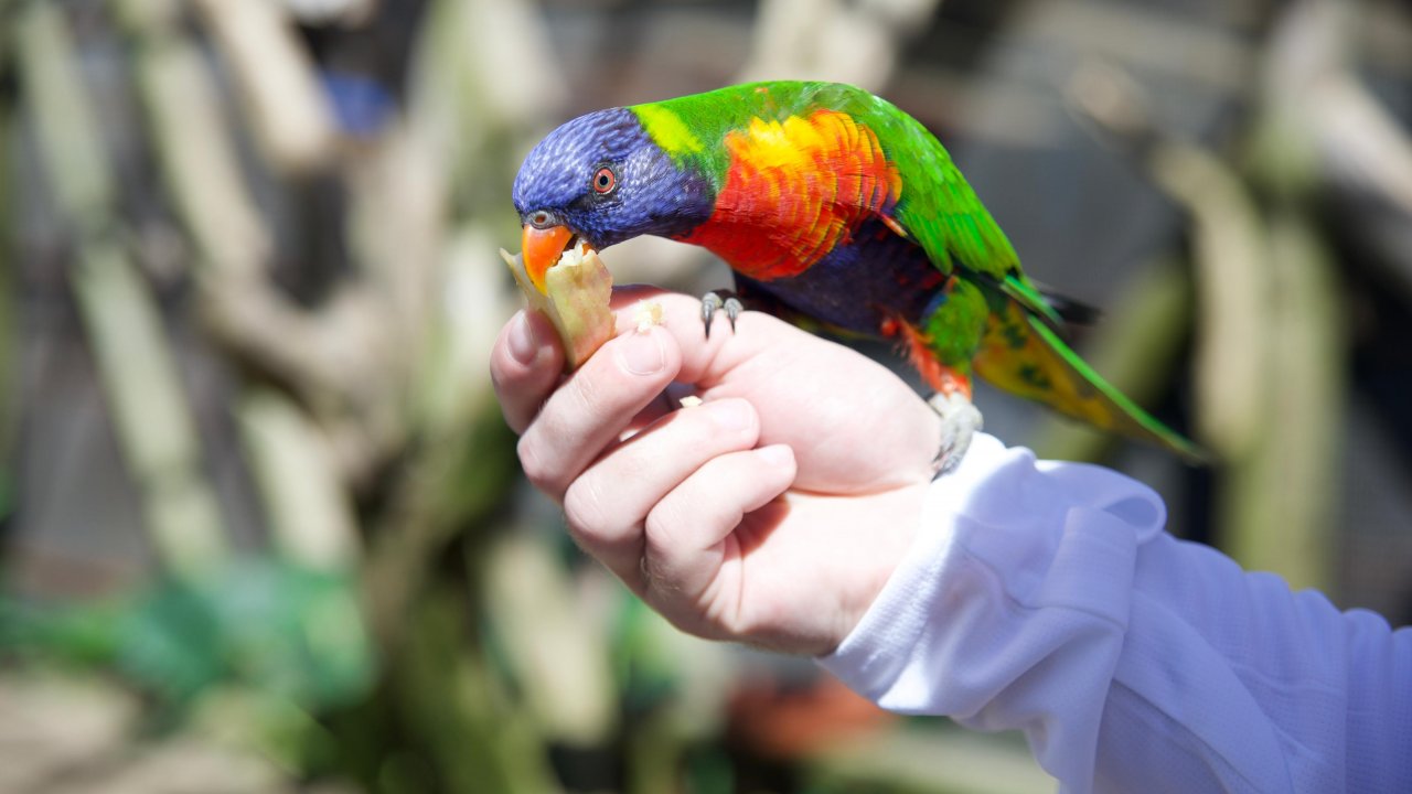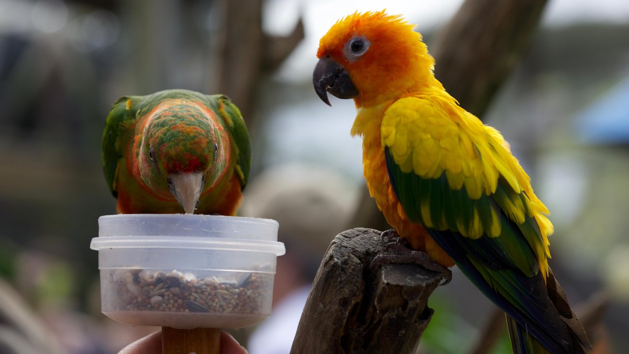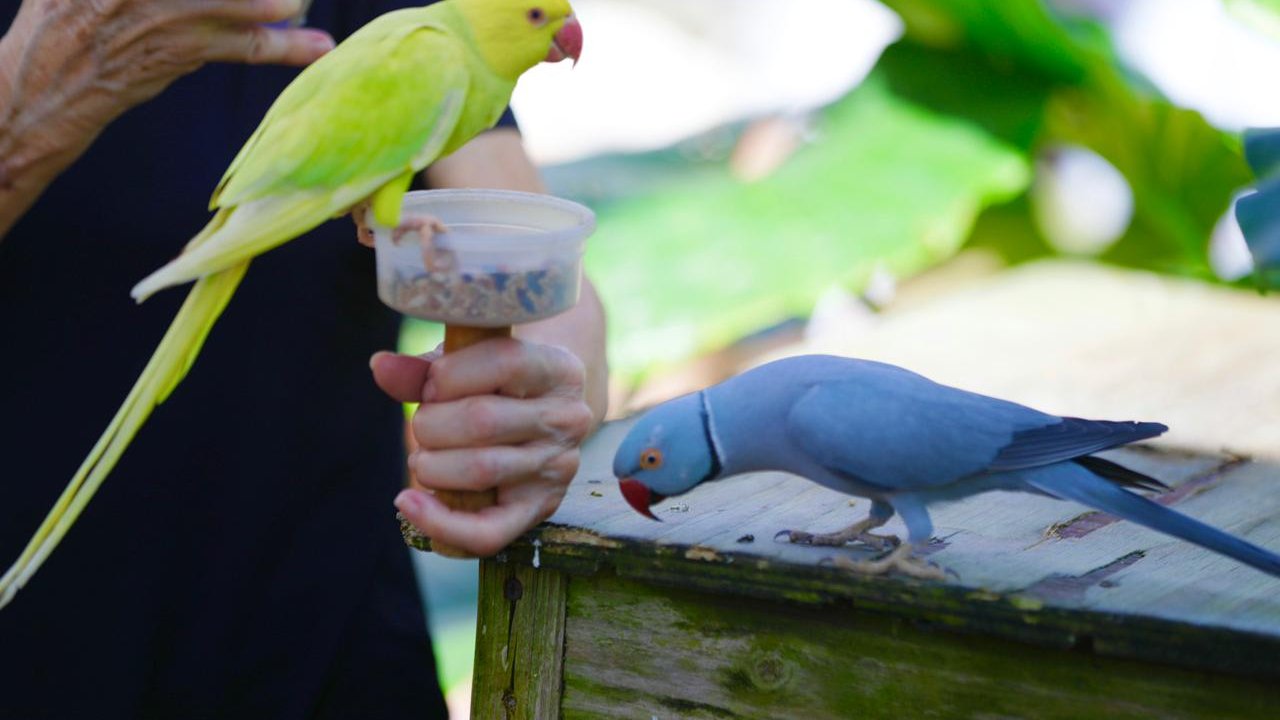 Birds perch on your hand or shoulder and feed from your cup